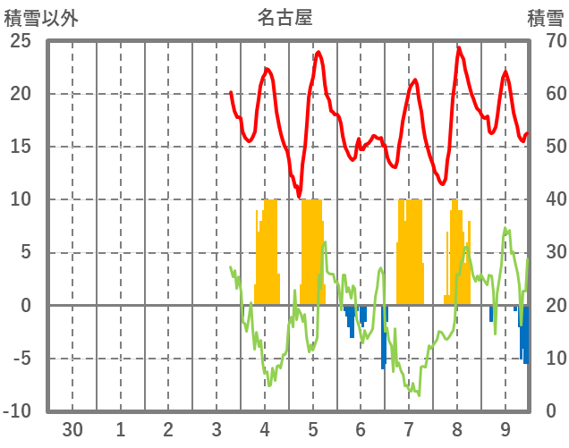 | 日 | 時 | 気温 | 降水 | 風向/風速 | 日照 | 積雪 | 降雪 |
