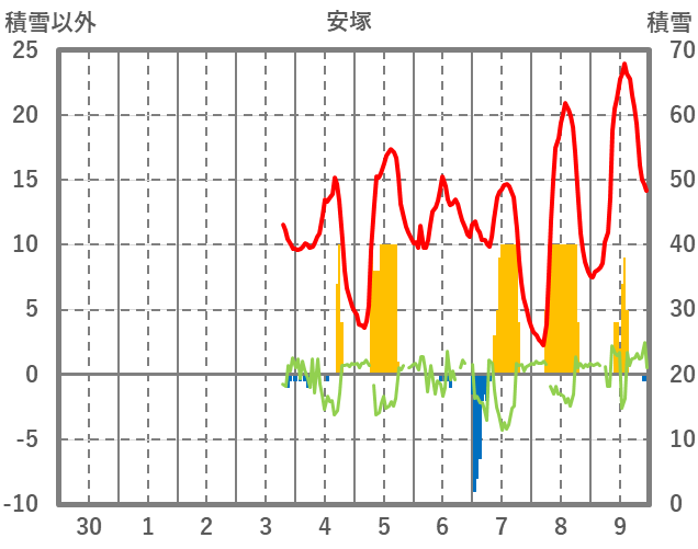 | 日 | 時 | 気温 | 降水 | 風向/風速 | 日照 | 積雪 | 降雪 |