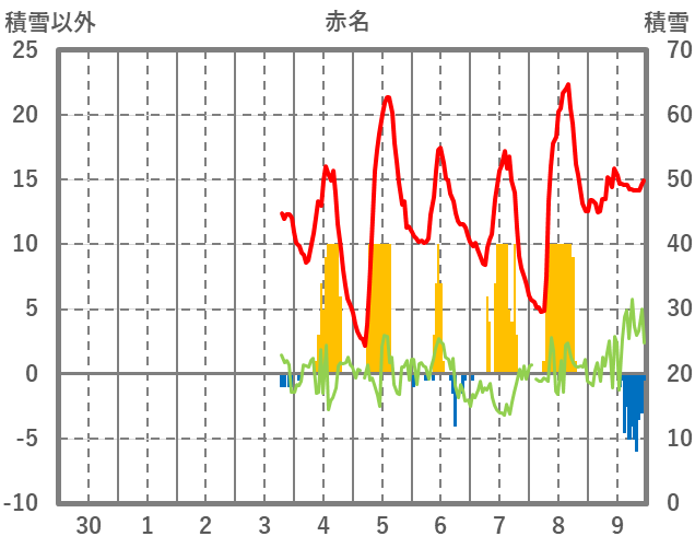 | 日 | 時 | 気温 | 降水 | 風向/風速 | 日照 | 積雪 | 降雪 |
