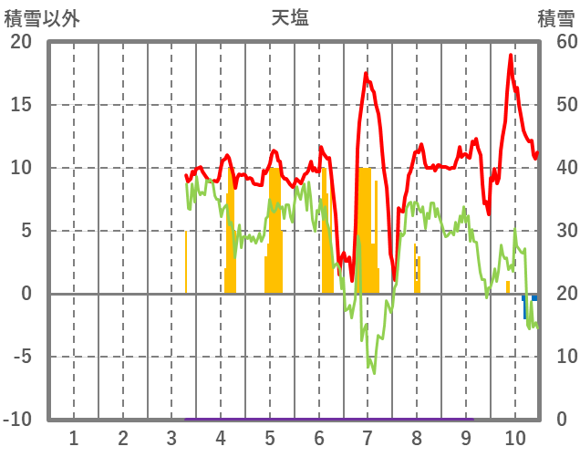 | 日 | 時 | 気温 | 降水 | 風向/風速 | 日照 | 積雪 | 降雪 |