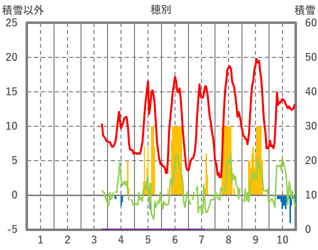 | 日 | 時 | 気温 | 降水 | 風向/風速 | 日照 | 積雪 | 降雪 |