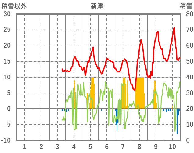 | 日 | 時 | 気温 | 降水 | 風向/風速 | 日照 | 積雪 | 降雪 |