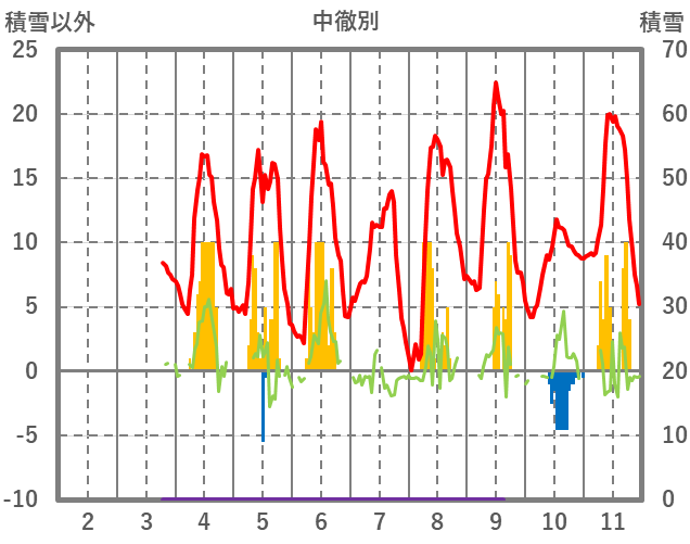 | 日 | 時 | 気温 | 降水 | 風向/風速 | 日照 | 積雪 | 降雪 |