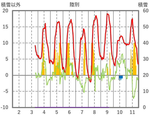 | 日 | 時 | 気温 | 降水 | 風向/風速 | 日照 | 積雪 | 降雪 |