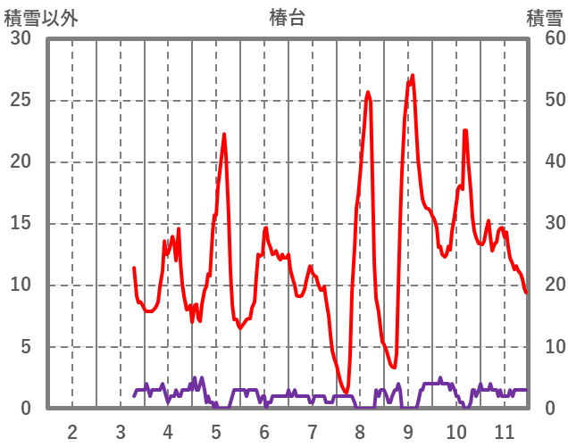 | 日 | 時 | 気温 | 降水 | 風向/風速 | 日照 | 積雪 | 降雪 |