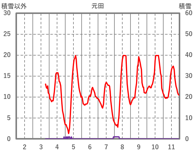 | 日 | 時 | 気温 | 降水 | 風向/風速 | 日照 | 積雪 | 降雪 |