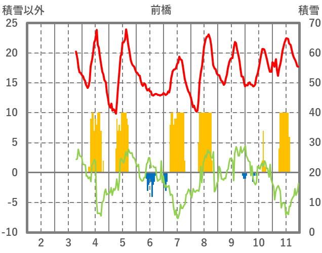 | 日 | 時 | 気温 | 降水 | 風向/風速 | 日照 | 積雪 | 降雪 |