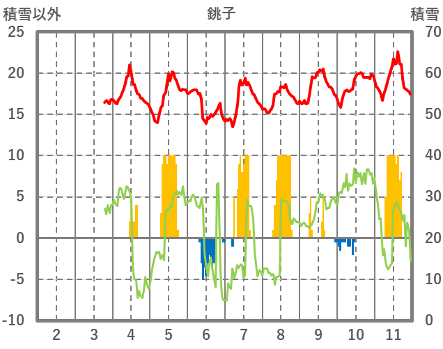| 日 | 時 | 気温 | 降水 | 風向/風速 | 日照 | 積雪 | 降雪 |