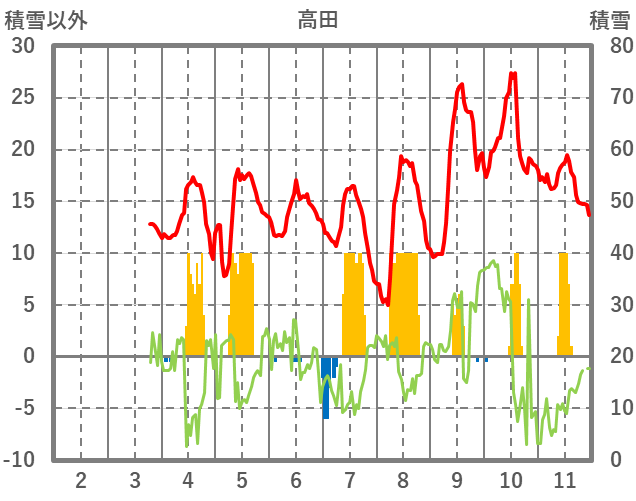 | 日 | 時 | 気温 | 降水 | 風向/風速 | 日照 | 積雪 | 降雪 |