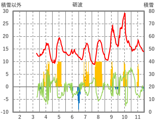 | 日 | 時 | 気温 | 降水 | 風向/風速 | 日照 | 積雪 | 降雪 |