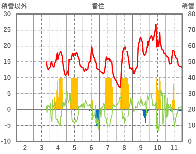 | 日 | 時 | 気温 | 降水 | 風向/風速 | 日照 | 積雪 | 降雪 |