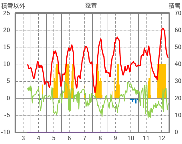 | 日 | 時 | 気温 | 降水 | 風向/風速 | 日照 | 積雪 | 降雪 |