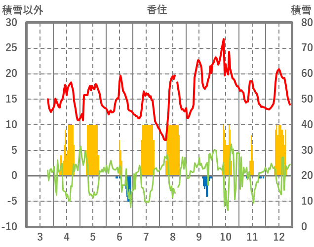 | 日 | 時 | 気温 | 降水 | 風向/風速 | 日照 | 積雪 | 降雪 |
