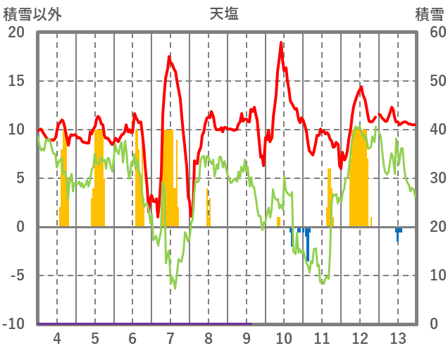 | 日 | 時 | 気温 | 降水 | 風向/風速 | 日照 | 積雪 | 降雪 |