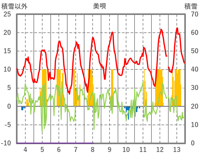 | 日 | 時 | 気温 | 降水 | 風向/風速 | 日照 | 積雪 | 降雪 |