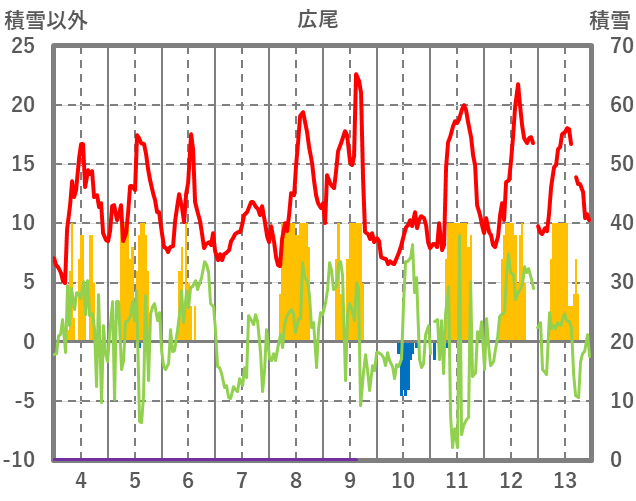 | 日 | 時 | 気温 | 降水 | 風向/風速 | 日照 | 積雪 | 降雪 |