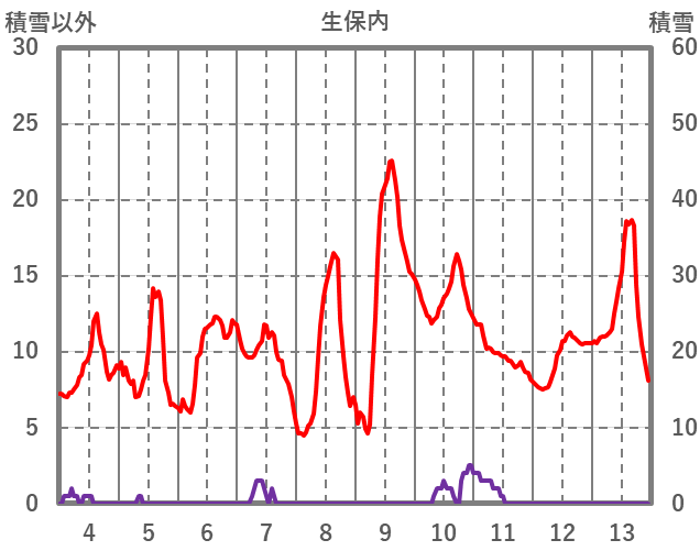 | 日 | 時 | 気温 | 降水 | 風向/風速 | 日照 | 積雪 | 降雪 |