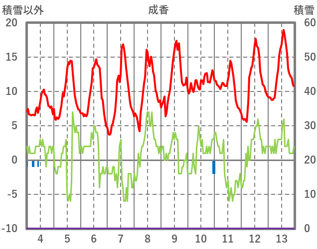 | 日 | 時 | 気温 | 降水 | 風向/風速 | 日照 | 積雪 | 降雪 |