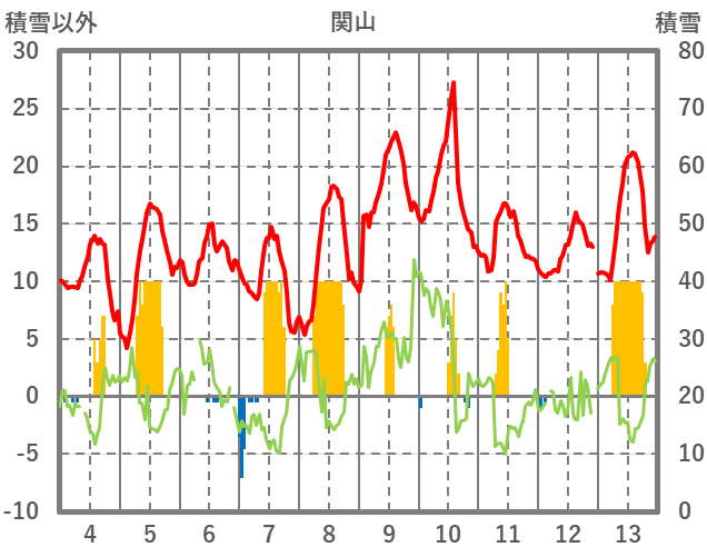 | 日 | 時 | 気温 | 降水 | 風向/風速 | 日照 | 積雪 | 降雪 |