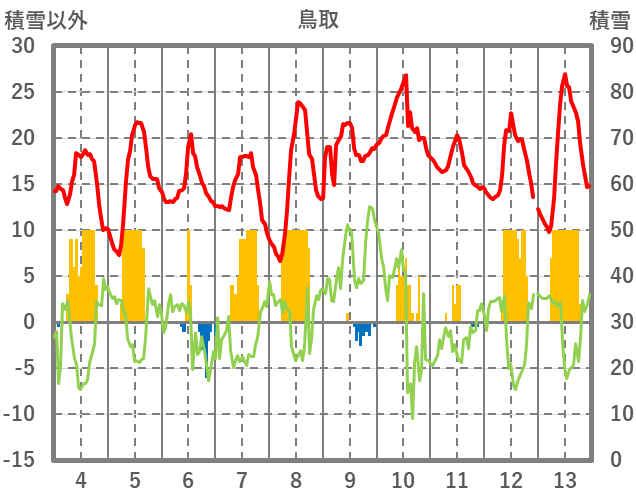 | 日 | 時 | 気温 | 降水 | 風向/風速 | 日照 | 積雪 | 降雪 |