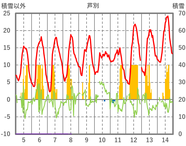 | 日 | 時 | 気温 | 降水 | 風向/風速 | 日照 | 積雪 | 降雪 |