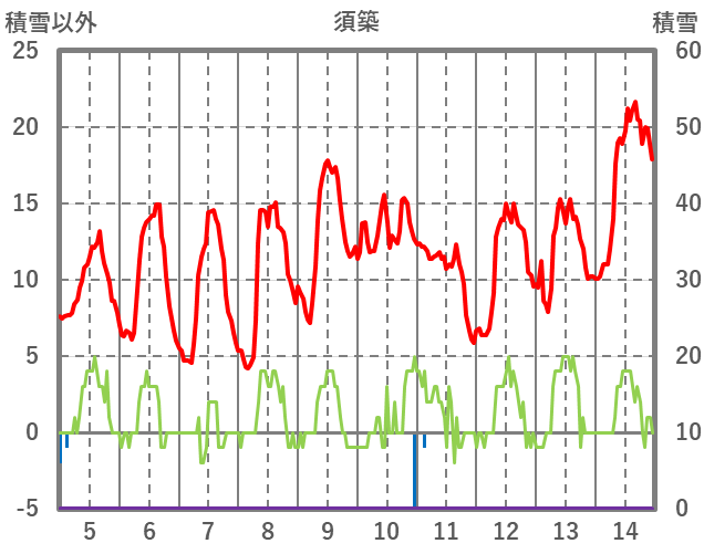 | 日 | 時 | 気温 | 降水 | 風向/風速 | 日照 | 積雪 | 降雪 |