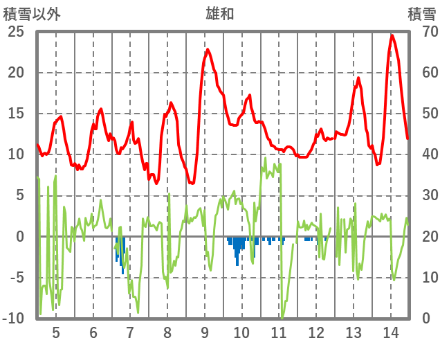 | 日 | 時 | 気温 | 降水 | 風向/風速 | 日照 | 積雪 | 降雪 |