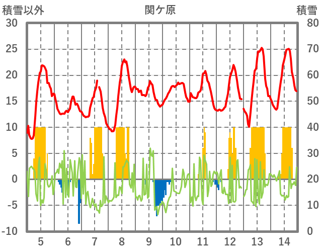 | 日 | 時 | 気温 | 降水 | 風向/風速 | 日照 | 積雪 | 降雪 |