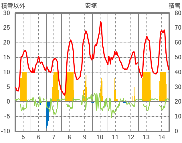 | 日 | 時 | 気温 | 降水 | 風向/風速 | 日照 | 積雪 | 降雪 |