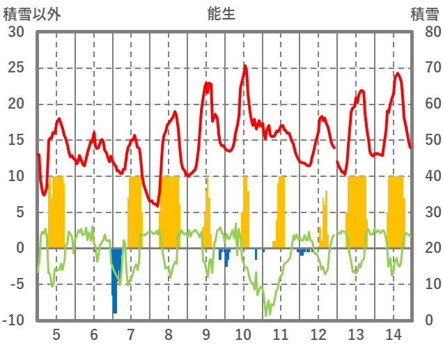 | 日 | 時 | 気温 | 降水 | 風向/風速 | 日照 | 積雪 | 降雪 |