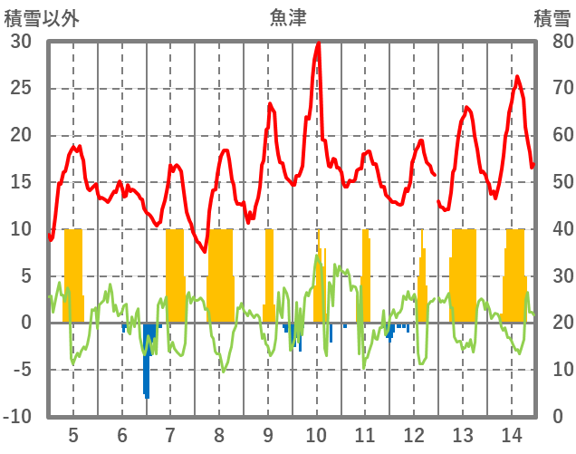 | 日 | 時 | 気温 | 降水 | 風向/風速 | 日照 | 積雪 | 降雪 |