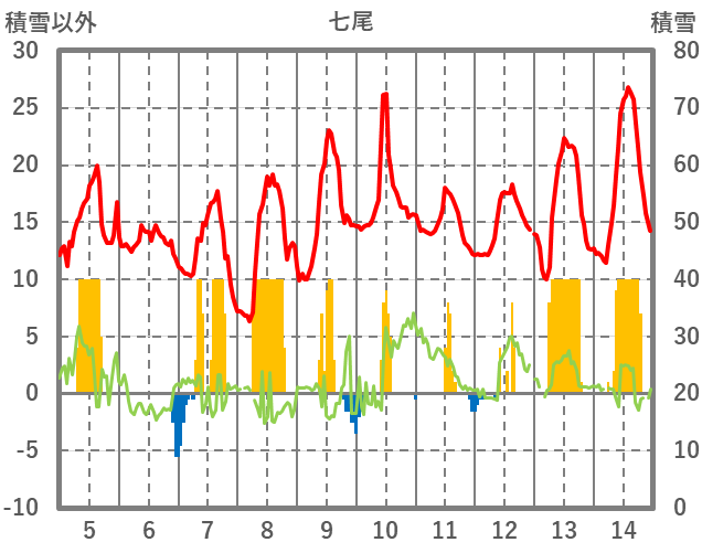 | 日 | 時 | 気温 | 降水 | 風向/風速 | 日照 | 積雪 | 降雪 |
