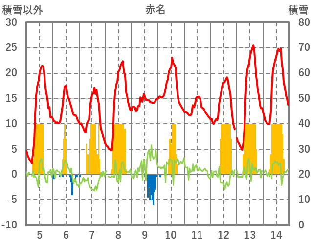 | 日 | 時 | 気温 | 降水 | 風向/風速 | 日照 | 積雪 | 降雪 |