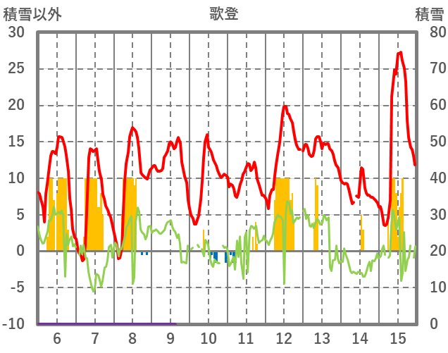 | 日 | 時 | 気温 | 降水 | 風向/風速 | 日照 | 積雪 | 降雪 |