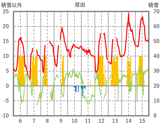 | 日 | 時 | 気温 | 降水 | 風向/風速 | 日照 | 積雪 | 降雪 |