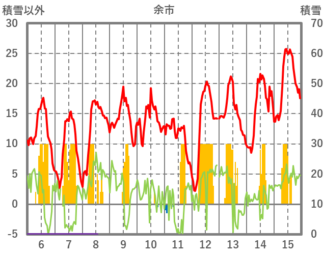 | 日 | 時 | 気温 | 降水 | 風向/風速 | 日照 | 積雪 | 降雪 |