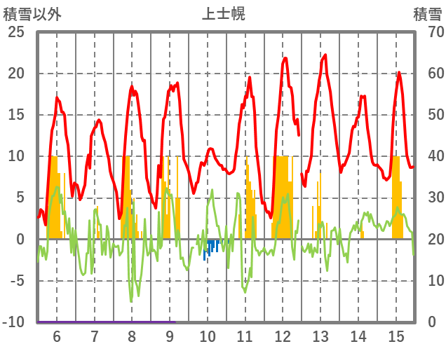 | 日 | 時 | 気温 | 降水 | 風向/風速 | 日照 | 積雪 | 降雪 |