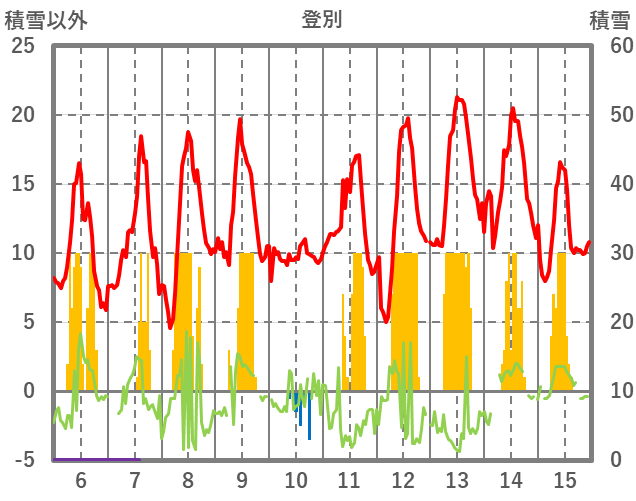 | 日 | 時 | 気温 | 降水 | 風向/風速 | 日照 | 積雪 | 降雪 |