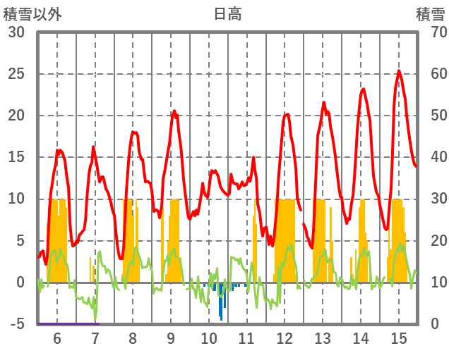 | 日 | 時 | 気温 | 降水 | 風向/風速 | 日照 | 積雪 | 降雪 |