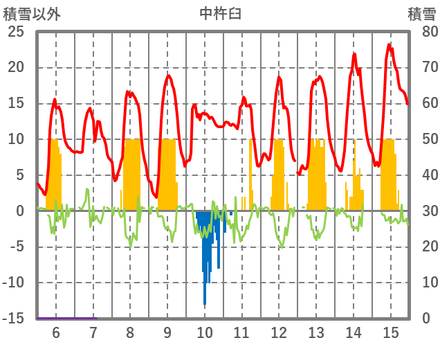 | 日 | 時 | 気温 | 降水 | 風向/風速 | 日照 | 積雪 | 降雪 |