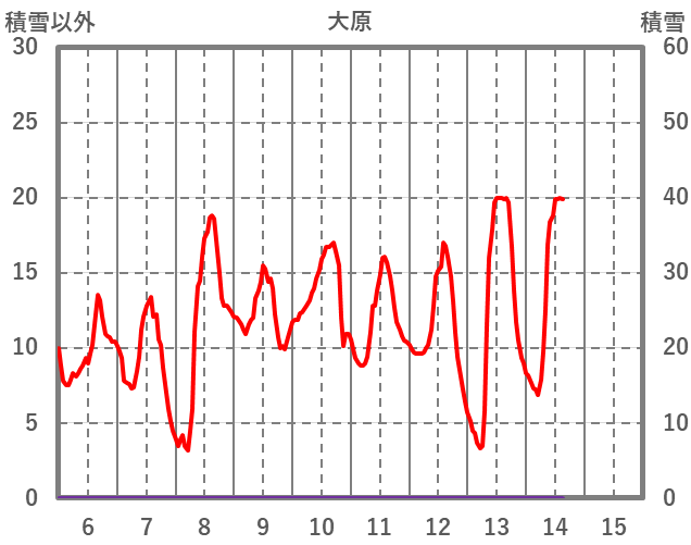 | 日 | 時 | 気温 | 降水 | 風向/風速 | 日照 | 積雪 | 降雪 |
