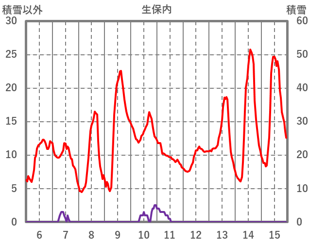 | 日 | 時 | 気温 | 降水 | 風向/風速 | 日照 | 積雪 | 降雪 |
