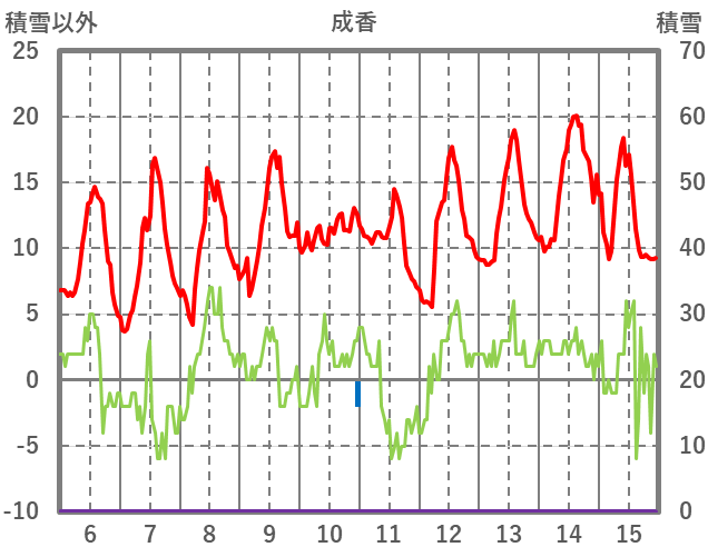| 日 | 時 | 気温 | 降水 | 風向/風速 | 日照 | 積雪 | 降雪 |