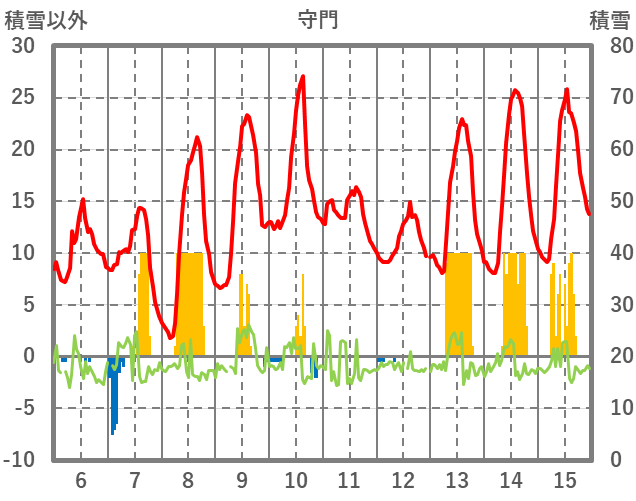 | 日 | 時 | 気温 | 降水 | 風向/風速 | 日照 | 積雪 | 降雪 |