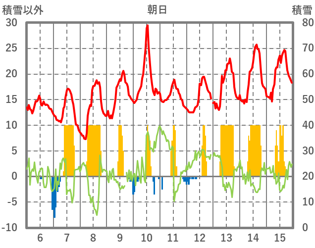 | 日 | 時 | 気温 | 降水 | 風向/風速 | 日照 | 積雪 | 降雪 |