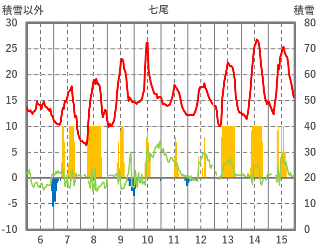 | 日 | 時 | 気温 | 降水 | 風向/風速 | 日照 | 積雪 | 降雪 |
