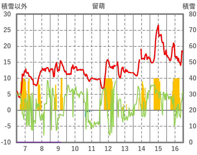 | 日 | 時 | 気温 | 降水 | 風向/風速 | 日照 | 積雪 | 降雪 |