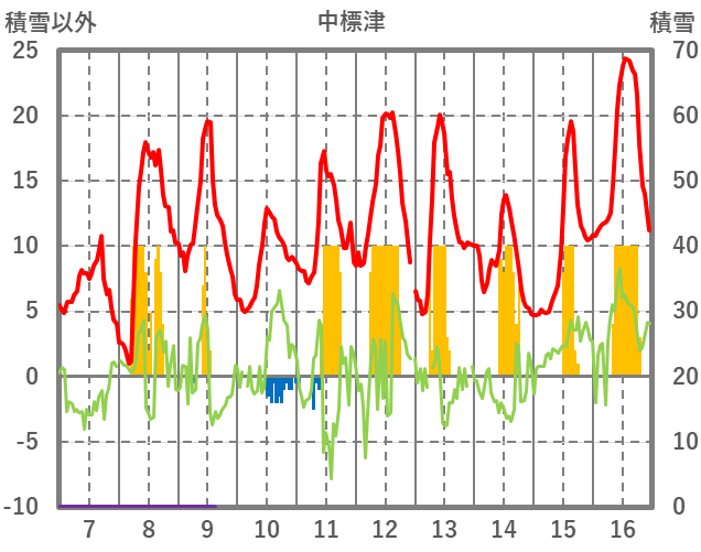 | 日 | 時 | 気温 | 降水 | 風向/風速 | 日照 | 積雪 | 降雪 |
