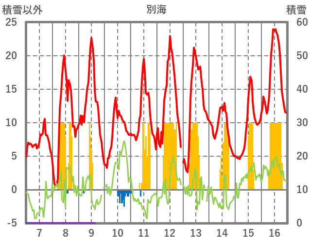 | 日 | 時 | 気温 | 降水 | 風向/風速 | 日照 | 積雪 | 降雪 |