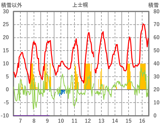 | 日 | 時 | 気温 | 降水 | 風向/風速 | 日照 | 積雪 | 降雪 |